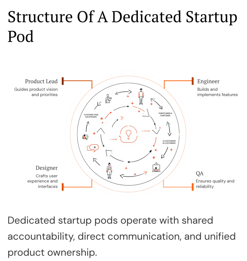 Dedicated startup pods are compact cross-functional units assigned to a defined product mission with long-term accountability. They combine engineering capability, product thinking, and embedded quality oversight within one cohesive structure.