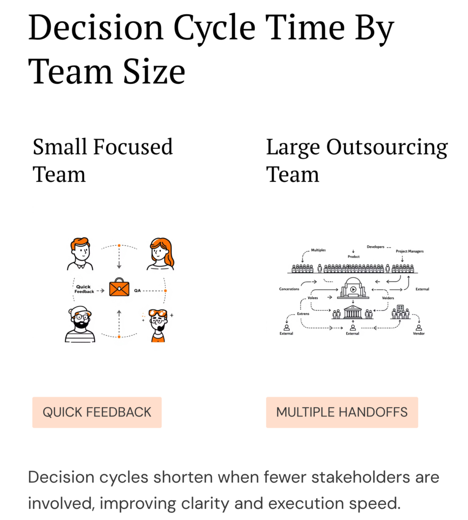 Large outsourcing vendors often promote scale as their primary advantage. A bigger bench of engineers reduces risk and accelerates timelines. However, as team size increases, coordination complexity grows exponentially. Every additional contributor introduces new communication pathways, which increases the likelihood of misalignment.