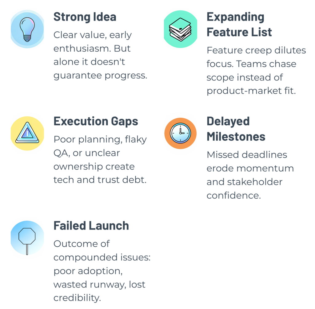 Many ventures struggle because planning lacks definition, requirements are unclear, and priorities shift without measurable checkpoints. These issues create execution gaps that stall progress and increase the chance of MVP launch failures.